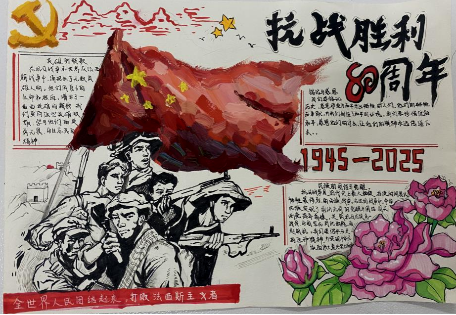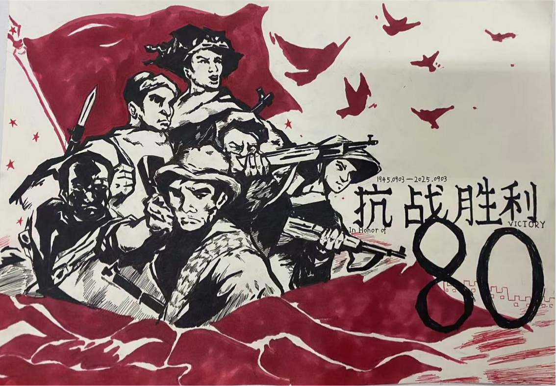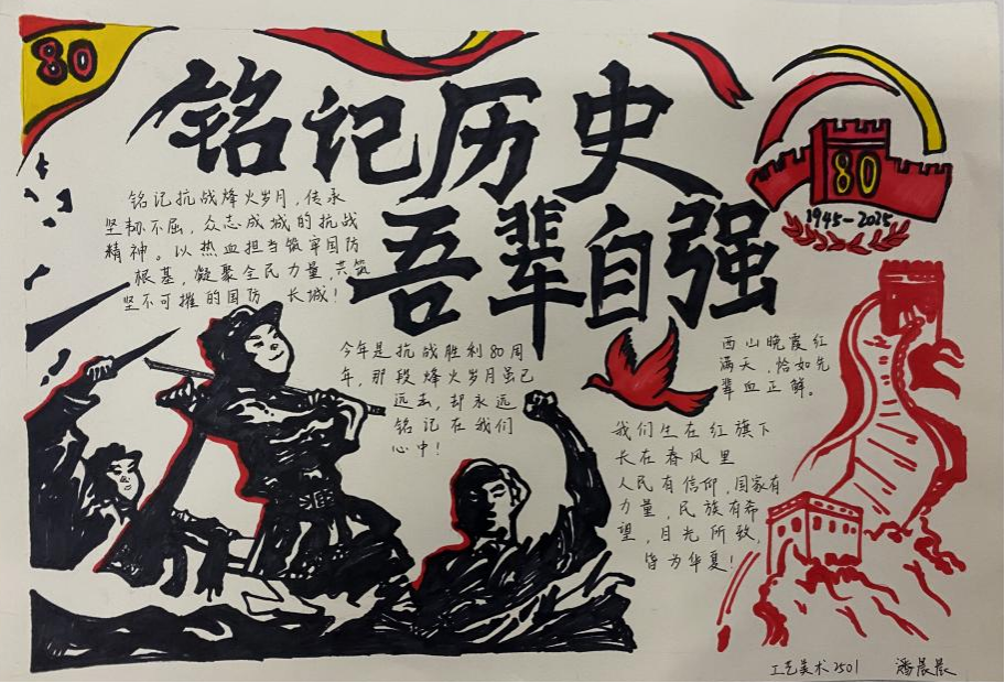 组织一次红色活动,赓续精神血脉。紧密结合纪念中国人民抗日战争暨世界反法西斯战争胜利80周年等重要时间节点,依托艺术与传媒学院专业特色,组织新生开展了主题手抄报绘制活动。同学们在创作过程中,主动查阅历史资料,深刻感悟革命先烈的英勇事迹与崇高精神,将红色基因融入艺术表达。此次活动不仅是一次专业实践的初步体验,更是一次生动的理想信念教育,使新生在潜移默化中铭记历史、缅怀先烈,增强了传承红色文化、赓续红色血脉的思想自觉和行动自觉。