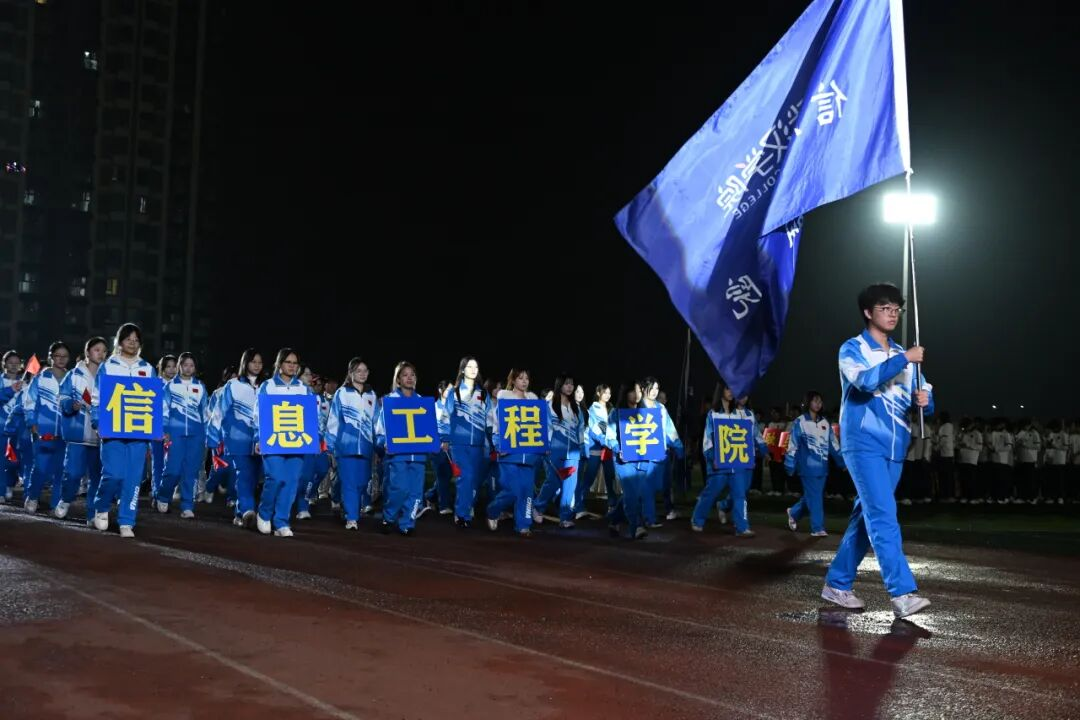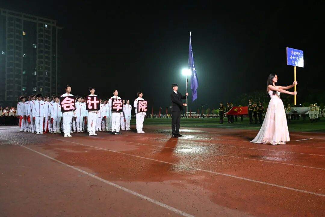 国旗护卫队步伐铿锵,擎旗入场,庄严肃穆。红旗方阵和各学院(部)代表队紧随其后,结合专业“各显神通”:算盘舞动、折扇翻转、代码光影交织,以创意表演尽显学子蓬勃朝气与青春风采。