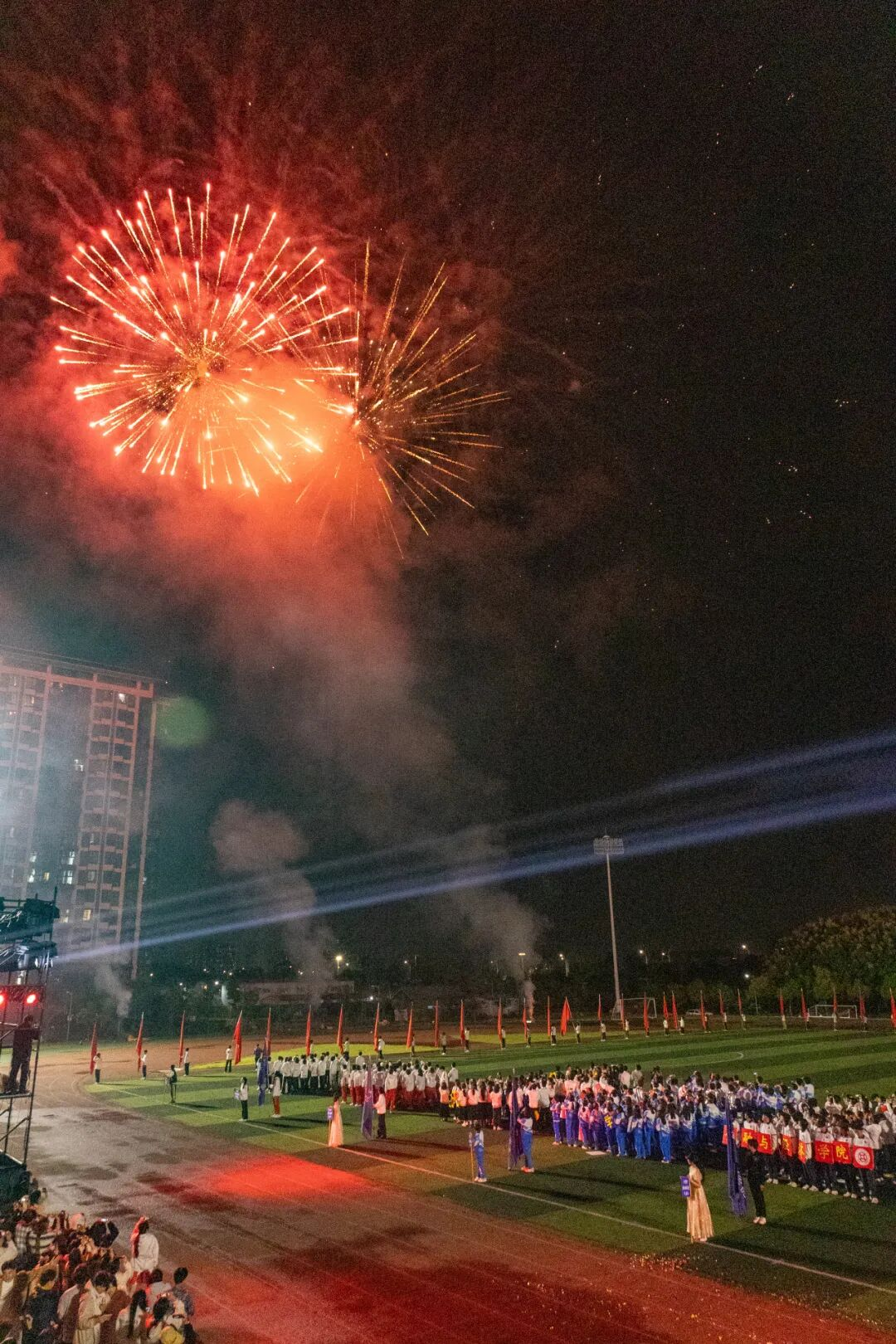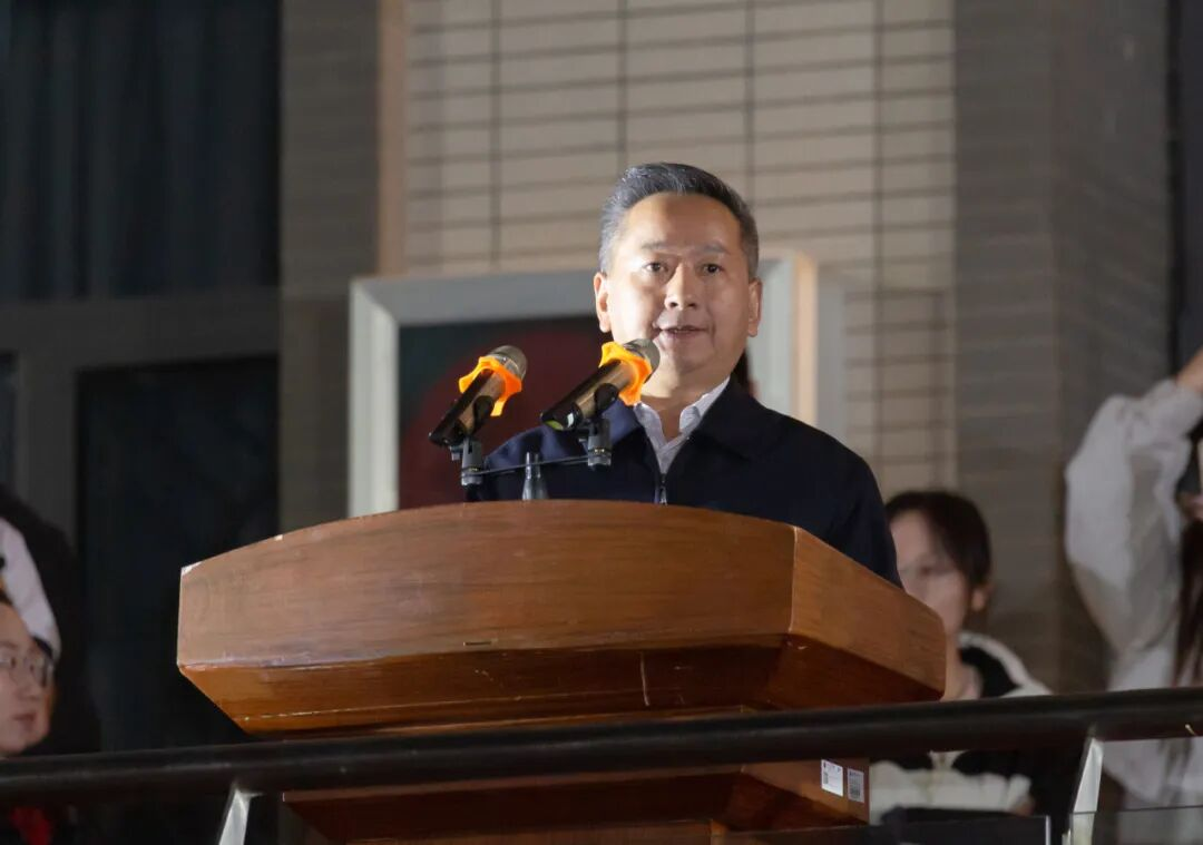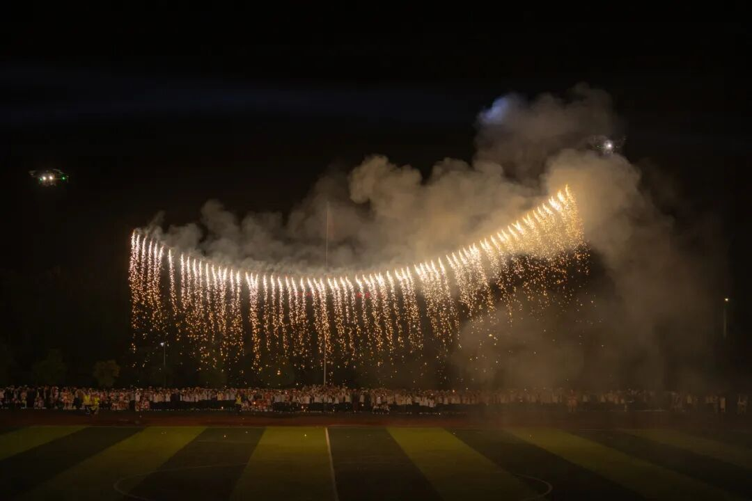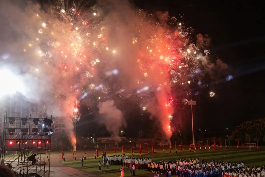 伴随着陈祖亮教授一声“开幕”响彻全场,刹那间烟花绽放,将武汉学院的夜空渲染得璀璨夺目。欢呼声与光影交织,映照在每一张仰望的笑脸上,师生们不约而同地高举手机,将这绚烂的“高光”时刻定格。