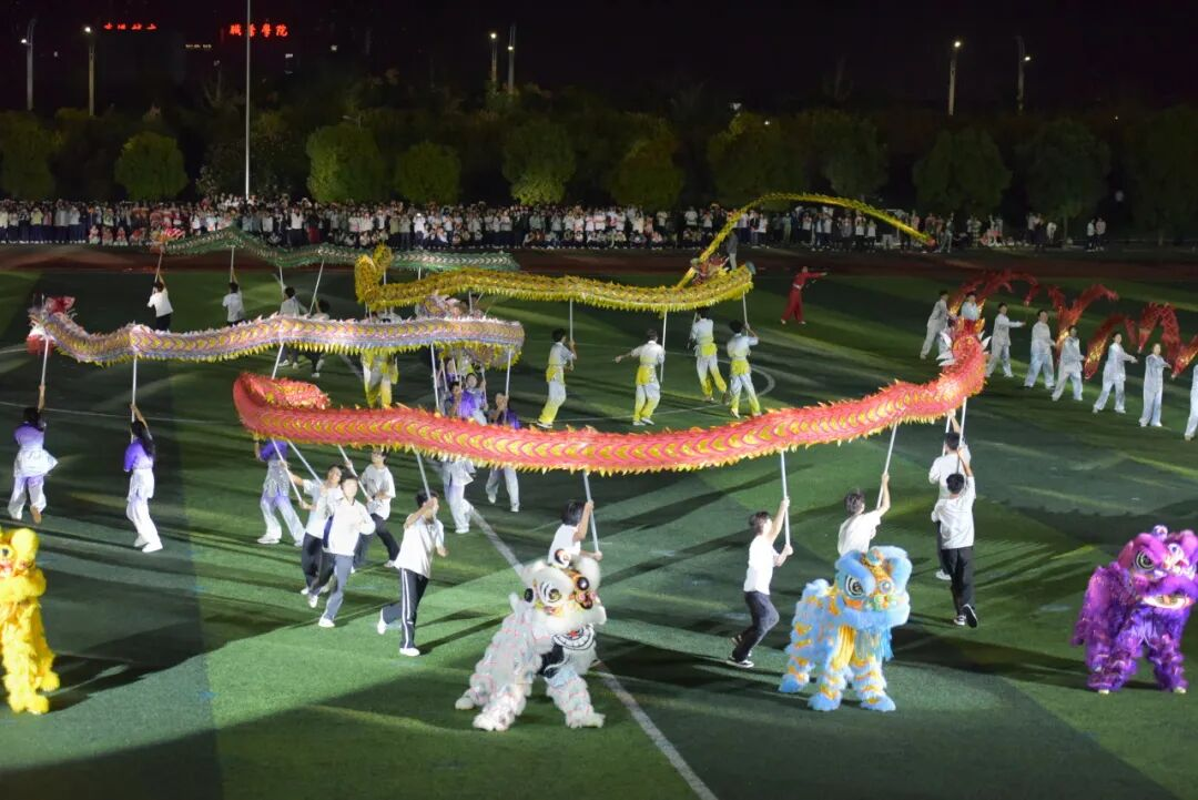 锣鼓震天,蛟龙腾跃,雄狮威武,传统舞龙舞狮与灵动彩带龙相互交融,共演《中华魂·运动韵》,只见舞狮摇头摆尾,憨态可掬,瞬间点燃全场!