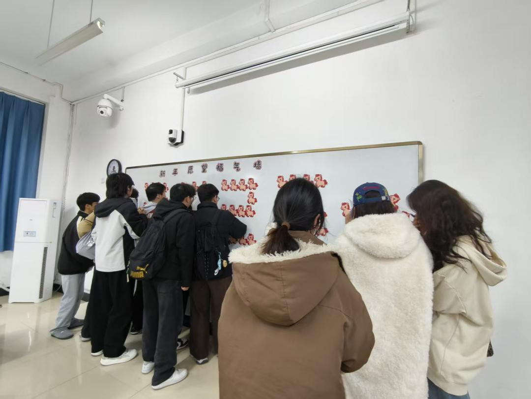 教室白板上由61张小马造型心愿卡拼组而成的“2026”新年愿望福气墙,成为全场焦点。同学们在卡片正面写下新学期目标:“希望四级顺利通关”“争取专业排名前进5名”……这些心愿错落拼搭,既象征着丙午马年的奋蹄之意,也寓意着61名同学携手启程。
