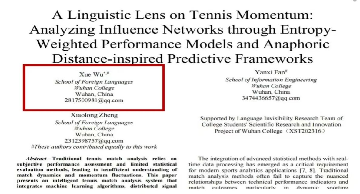 这种“不糊弄”的劲儿,贯穿了她的后续旅程。在建模学习后期,团队需要将语言学概念“指代距离”量化,并用于网球比赛的动量分析模型。这个点子,恰好结合了她的专业背景和新技术。为了验证它,她泡在论文和数据集里,反复调试。最终,这项研究成果让她以第一作者身份,在EI(工程索引)收录的学术会议上发表了论文。论文的合作者来自信息工程学院,署名中清晰地写着:Xue Wu, School of Foreign Languages。