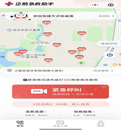 “设备再好,关键时刻找不到也是白搭。”为了让师生能快速定位最近的AED,后勤保障处开通了线上线下双重指引通道:师生只需打开“企鹅急救助手”小程序,就能实时查看就近AED位置;系统还能同步向附近的持证急救员发出求救信息,实现“设备+人员”的快速联动。