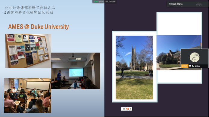 吴爱华博士是2019-2020美国杜克大学东亚系的访问学者。她从刚结束的访问学习开始分享。首先,她简单介绍了杜克大学以及她所在的东亚系情况。杜克大学(Duke University)创建于1838年,其前身是Trinity College of Arts & Sciences,坐落于美国North Carolina的Durham市,是一所世界顶级的研究型大学,也是全美最优秀的大学之一、美国南部最好的私立大学。