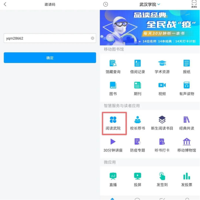 ③在首页点击“阅读武院”模块加入小组写话题打卡。