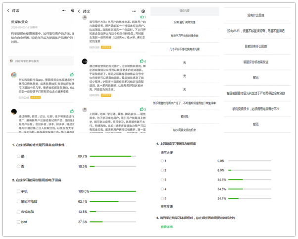 关于线上教学模式,老师们一般都利用了慕课平台的网课资源、后台数据、考勤签到、发起讨论等功能,以及教学班级QQ群的资料分享、课程答疑、在线授课(或借助腾讯课堂等第三方工具在线授课)等功能,总体上采取慕课资源为辅、在线实时授课为主的方式开展教学。不过,部分老师也充分挖掘并利用了慕课平台的特殊优势,如艺传学院的周胜老师的主要教学环节是在中国大学慕课平台上实现的,即通过慕课堂完成了讲授、练习和讨论等教学的主干部分,而在QQ群完成任务布置、答疑和复习等交流互动部分,并良好地控制了教学进度。他表示,慕课平台的教学课程体系完整,后台数据完备,便于精细化教学;而且学生学习的行为数据、反馈和回答问题数据都能保存,便于老师改进教学方式,调整后续的教学内容,因此能够作为主要教学平台。