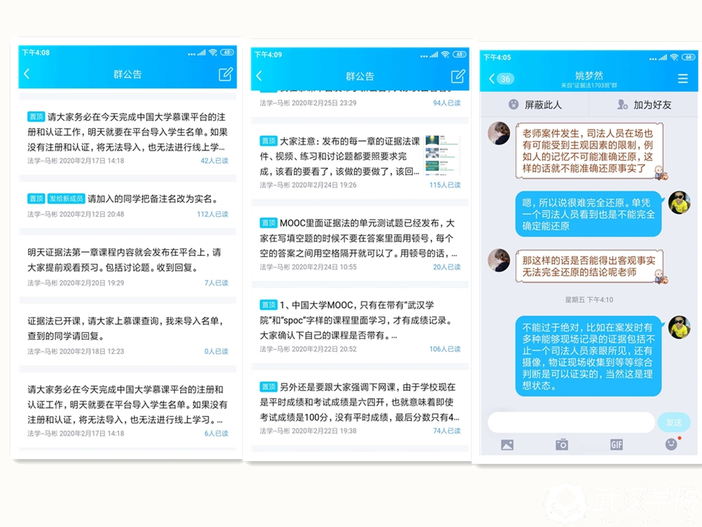 线上开课一周来,法学院各任课教师借助在线学习平台、社交软件等信息化工具完善课程组织形式,以线下备课为基础,精心落实每一门线上课程的教学安排,采取人性化、个性化和多样化的教学方式开展线上教学工作。课堂上,老师们纷纷化身“网络主播”,各显神通,采用慕课、直播、视频、音频、在线讨论、线上答题等多种形式积极开展教学互动,为同学们带来一场又一场精彩的课堂。通过一周的线上教学实践,老师和同学们对线上教学平台及多种教学模式越来越熟悉,运用越来越熟练,教与学的互动越来越积极。