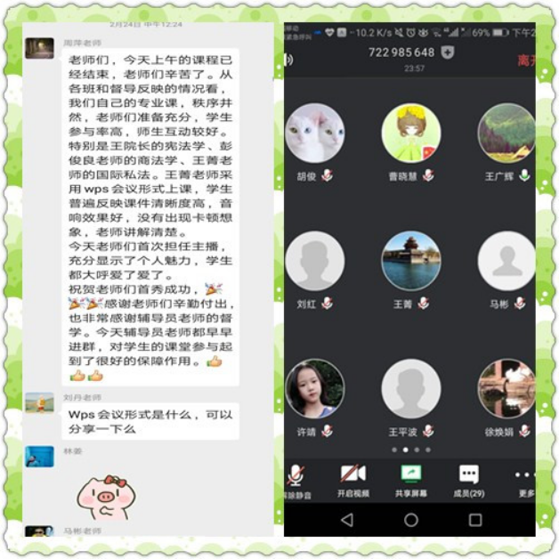 教师是线上教学的灵魂和基础,法学院前期动员教师积极参与平台建课,教师们通过平台多次培训以及自己的不懈摸索,顺利完成了发布学习要求、上传学习内容、布置学习任务等各项准备工作。另外学院督促所有教师建立课程群,鼓励他们尝试运用钉钉、腾讯会议、qq群、wps、慕课堂等工具进行试课,选出最适合的教学工具。同时,为了及时解决教师在授课时遇到的各项问题,法学院建立了线上例会制度,在会议上,教师们畅所欲言,将自己的教学难题或者教学经验分享给其他人,以确保教学质量不滑坡。