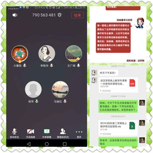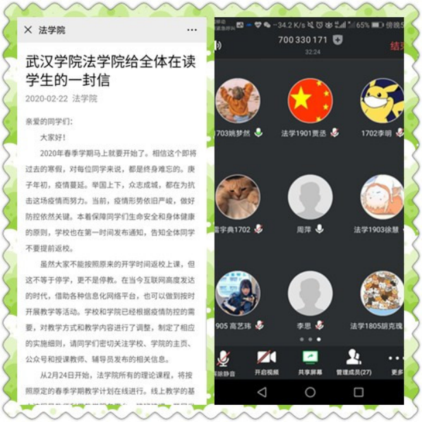 当然,如此大规模的线上教学对老师和学生乃至学院都是巨大的挑战。从第一周的教学情况看,个别平台的运行还不是特别畅通,偶尔出现卡顿现象;教师的教学内容还需要进一步的提炼和深化;部分学生对线上教学还不是很适应,学习自觉性不高,但我们相信在学校的统一领导下,法学院将进一步调整、磨合,探索出一条独具武汉学院法学特色的线上教学之路,实现“延学不降质”的目标。