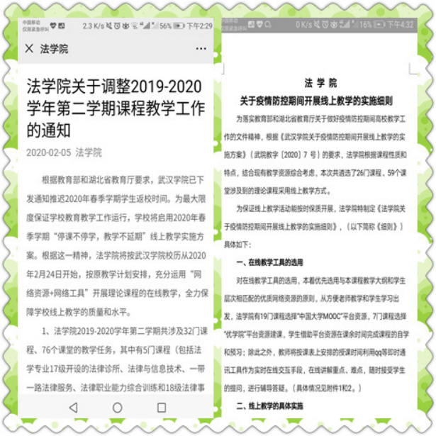 法学院根据教育部和教育厅以及武汉学院关于做好疫情防控期间高校教学工作的方案,结合法学院课程性质特点,在第一时间制定并发布《法学院关于调整2019-2020学年第二学期课程教学工作的通知》、《法学院关于疫情防控期间开展线上教学的实施细则》等教学文件,成立了以院长挂帅的“在线教学质量监督与保障委员会”,分教研室多次召开线上教学专题研讨。学院以“延学不降质”为宗旨,以教师和学生为抓手,统一指挥、统一部署、各司其职、各负其责。保证了教学活动的顺利开展。