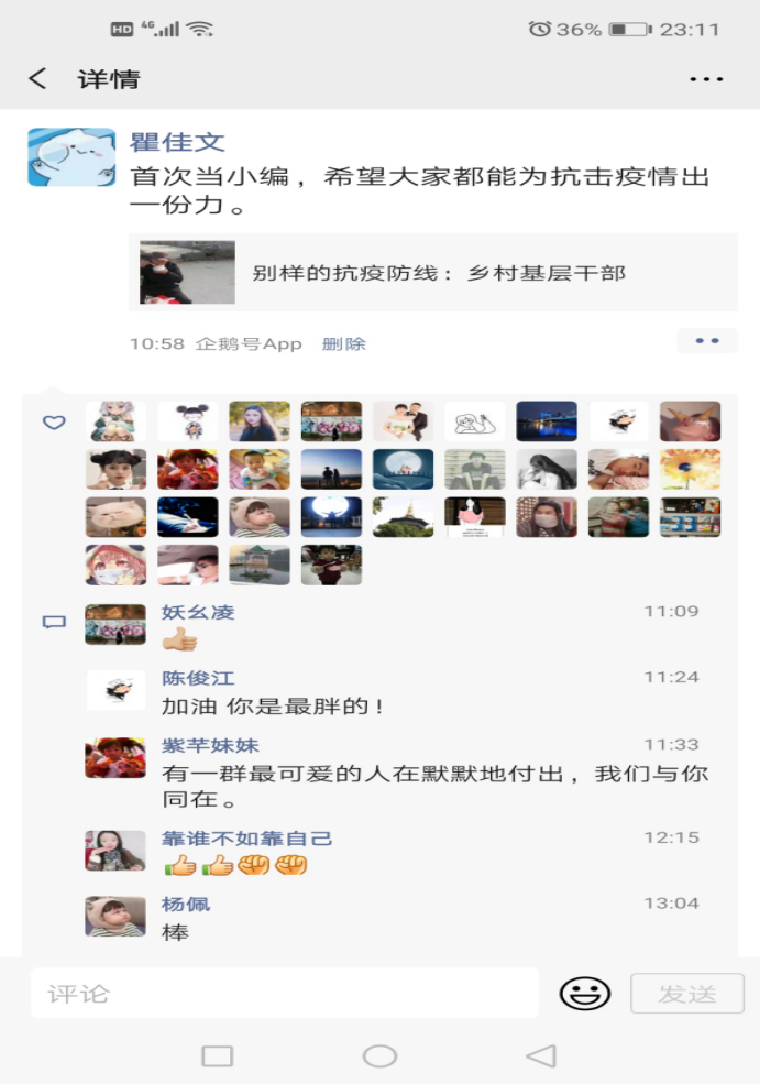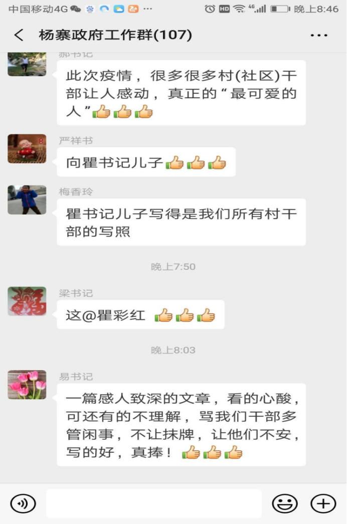 我写了这篇文章《别样的抗疫防线:乡村基层干部》,并不是想它能引起多大的轰动或者我能获得多大的关注,这不是我想做的我也做不到。我只是想让大家看看,让村民看看,让他们知道有这样一群人以血肉之躯铸成城墙挡在他们和病毒之间,告诉他们:有我们在,别怕。
