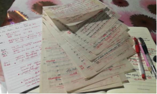因为疫情来的突然,不少老师春节返回老家,有的手头没有教材,有的缺少直播设备,但他们克服重重困难,在开课第一天准时上线。身在恩施老家的谢承凤老师收集教学素材,认真备课,手抄厚厚一叠教材,保证课堂“含金量”。