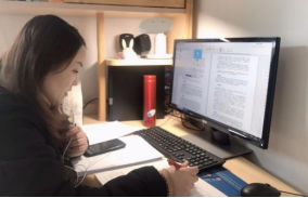 新闻1801班陈佳露:“网络教学最大的优点就是,我在没有听懂的地方可以拖动进度条返回再看一遍直至理解。但是我还是希望能够快点回到学校,坐在教室与老师面对面的交流,和同学坐在一起讨论,开启头脑风暴。”