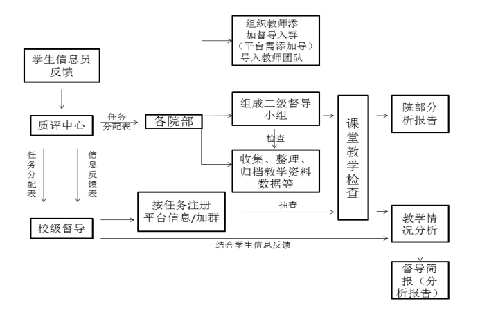 为保障网络教学质量,我校制定了《武汉学院疫情防控期间教学质量监测与评价工作方案》,以基于学生学习成效为出发点,通过学生学习过程成果和效应来评价教师的在线教学质量。重点从“五维度”(学生评教、学生信息员反馈、师生教学质量满意度调查、教师教学文件检查、教师在线教学评价)有效监控“教师教的质量”和“学生学的质量”;从“三层级”(校级教学督导员、院级教学督导组、学生信息员)进行下沉式教学检查与管理。各级成员将分别进入各门课程的教学平台,实行任务分包,进行线上教学巡查,并及时针对线上教学出现的问题组织教师进行探讨交流,确保教学高质量。通过质量监控为在线教学保驾护航。