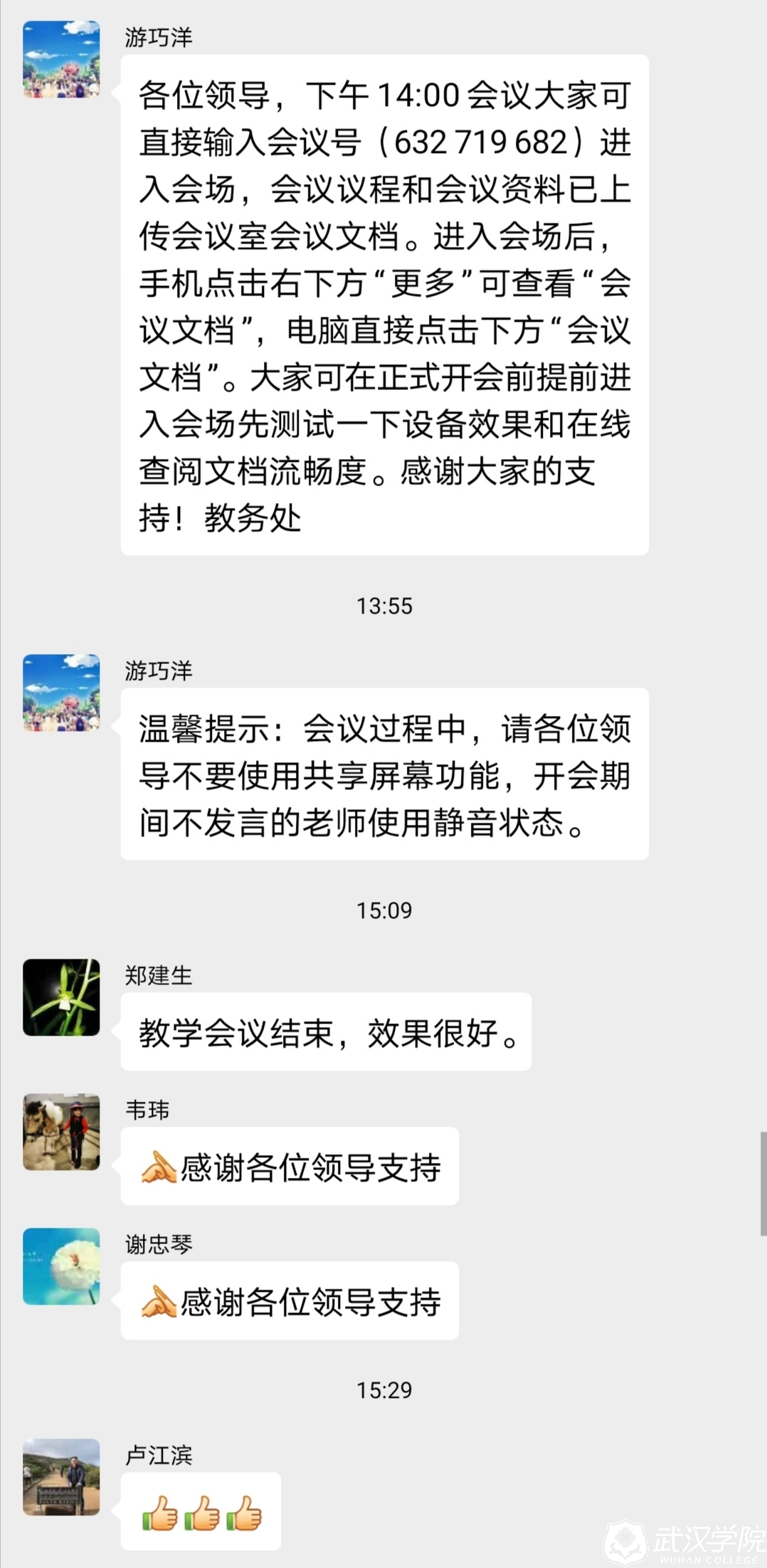 副校长郑祝君对各单位和各位老师在疫情防控期间线上教学准备工作中展现出的工作责任感给予了肯定和感谢,希望各单位鼓励并帮助师生做好在线教学工作,加强教学质量监控管理。