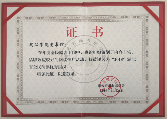 12月3日,湖北省图书馆学会公布了《2018年全民阅读相关称号的决定》。我校图书馆荣获“2018年全民阅读优秀组织”称号,而且是在本次评选中获得此项荣誉称号的两所民办高校图书馆之一。