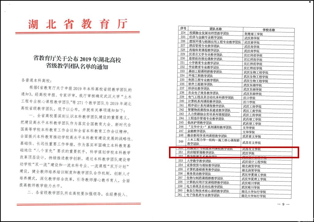 近日,湖北省教育厅公布了2019年湖北高校省级教学团队和省级优秀基层教学组织名单,我校供应链管理教学团队和新媒体及应用教研室分别荣获2019年湖北省高等学校“省级教学团队”和“省级优秀基层教学组织”荣誉称号。