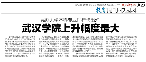 记者注意到,武汉学院是排行榜上升幅度最为显著的高校之一。该校是由腾讯主要创始人陈一丹创办的公益民办大学,马化腾等热心公益的企业家和社会人士参与共建。与传统高校不同,学校独辟国际化应用型办学之路,与全球领先的企业和专业机构合力打造特色专业。2016年,武汉学院成为了湖北省唯一一家进入一本招生的民办高校,该校与腾讯合办的软件工程(腾讯精英班)、与英国皇家特许会计师协会合办的会计学(ACA班)、与英国皇家特许管理会计师公会合办的财务管理(CIMA班)三个专业受到了大量一本考生的青睐,湖北理科录取最高分达610分。