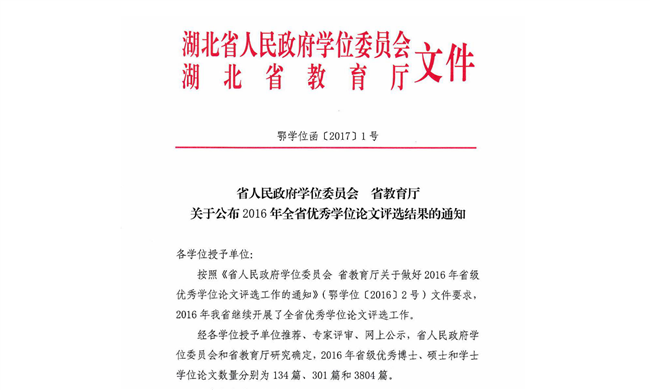 2016年,湖北省学位办和省教育厅开展学士学位论文评选工作,由学校根据省学位办分配的省级优秀学士学位论文指标组织专家评审,并将优秀论文名单、评审办法及工作总结上报省学位办,由省学位办抽查审核确定后发文公布。本次评选,我校共15篇获评省级优秀学士学位论文(具体名单见附表)。获评省优秀学位论文不仅体现了学生大学四年取得的成绩,也反映出社会对我校教育教学质量、办学水平的认可。下一步,我校将继续坚持全人发展教育理念,紧紧围绕成果导向教育,狠抓教学质量,深化教学改革,加大实践教学投入,提高我校教育教学水平。