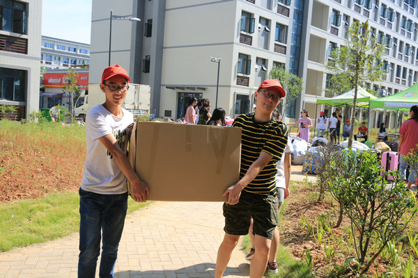 此次搬迁分两天进行,第一天进行的是工商管理系、法律系、外语系和信息及传播学院四个院系的学生搬迁。第二天则是会计及金融学院和艺术系两个院系的学生搬迁。14级本科女生集中迁至大学城校区桂檀斋1舍、兰蕙斋2舍和3舍,男生集中迁至竹枫斋3舍、4舍。考虑到行李较多,学校联系了十多辆专业搬家大货车往返于光谷校区和大学城校区循环搬运。在光谷校区,同学们提前将物品整理完毕,分批次的有条不紊的进行装车。到达大学城校区指定卸货点后,在志愿者的协助下,同学们很快找到了自己的宿舍,并将行李顺利搬进宿舍。