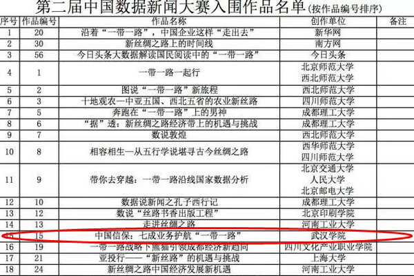 近日,由武汉学院传播系选送的数据新闻作品《中国信保:七成业务护航一带一路》入围第二届中国数据新闻大赛决赛,决赛将于5月7日在北京师范大学举行,届时我校将与清华大学、复旦大学、人民大学等国内顶尖大学同台竞技,一决高下。