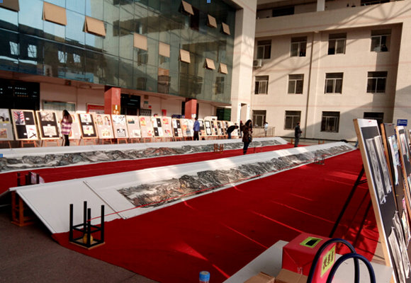 本次展览中有一幅长达80多米的画卷,是由艺术设计系何德坤老师亲笔作画,笔墨之间酣畅淋漓,激扬山河。通过对何老师的采访了解到此画是经过五年时间的实地考察、收集背景资料以及构思,耗时一年半绘画完成这幅佳作。