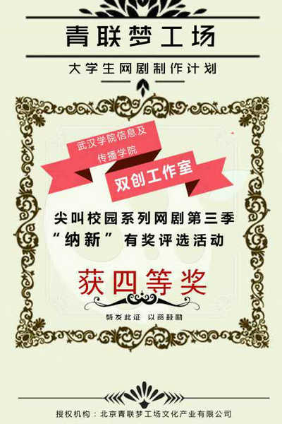 近日,从我校传播系得到喜讯,该系“双创工作室”自制网剧《招新大比拼》喜获“青联梦工厂全国大学生网剧比赛”第四名,获500元现金奖励。