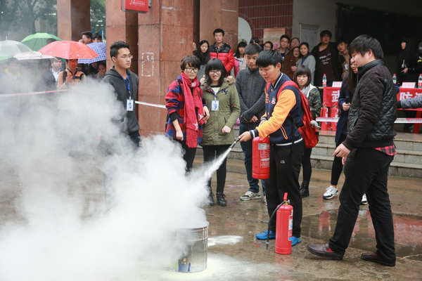 义务消防员演练使用灭火器(摄影:学生 曾晨)