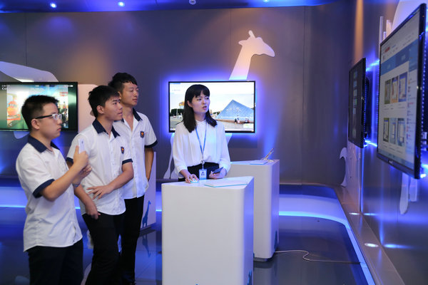 在用户体验与设计中心,三人走进了AR(增强现实技术)与VR(虚拟现实)用户体验研究区域。在互动娱乐研发部游戏研究团队负责人梁冰的介绍下,三人兴致勃勃的体验了使用头戴式虚拟现实设备,以及由手柄、主机和荧幕构成的增强现实技术的游戏。