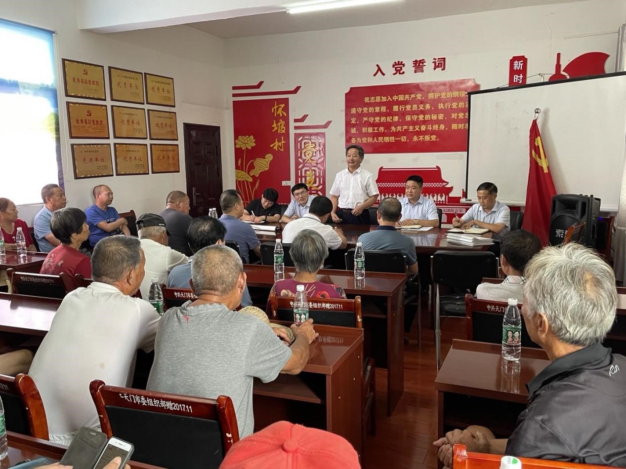 天门市委副秘书长杨于宏在会上讲话。他对武汉学院和驻村工作队的辛勤付出表示感谢,祝愿武汉学院工作队在新的岗位取得更大成绩。他表示,这些年来武汉学院用“真金白银”的投入,给予怀坡村政策、资金上的支持,派驻精兵强将驻村帮扶,助力怀坡村取得了脱贫攻坚的胜利,基础设施不断完善,顺利步入乡村振兴。希望武汉学院把对村镇的深厚感情带回去,经常过来走走看看。