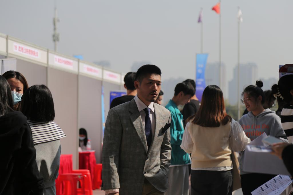 10月27日上午,马化腾教学楼前广场人声鼎沸,“2021年秋季‘武汉知名企业高校行’武汉学院专场招聘会”热烈进行着。此次招聘会邀请了广发证券、顶益食品、众联集团等59家知名企业进行招聘,武汉市人才服务中心主任熊军莅临现场考察指导。