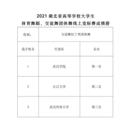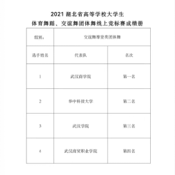 12月20日,2021年湖北省高等学校大学生体育舞蹈·交谊舞线上团体舞锦标赛结果出炉,我校国际标准舞协会的32名队员在此次“交谊舞拉丁类团体舞”和“交谊舞摩登类团体舞”比赛中分别取得第一和第三的好成绩。