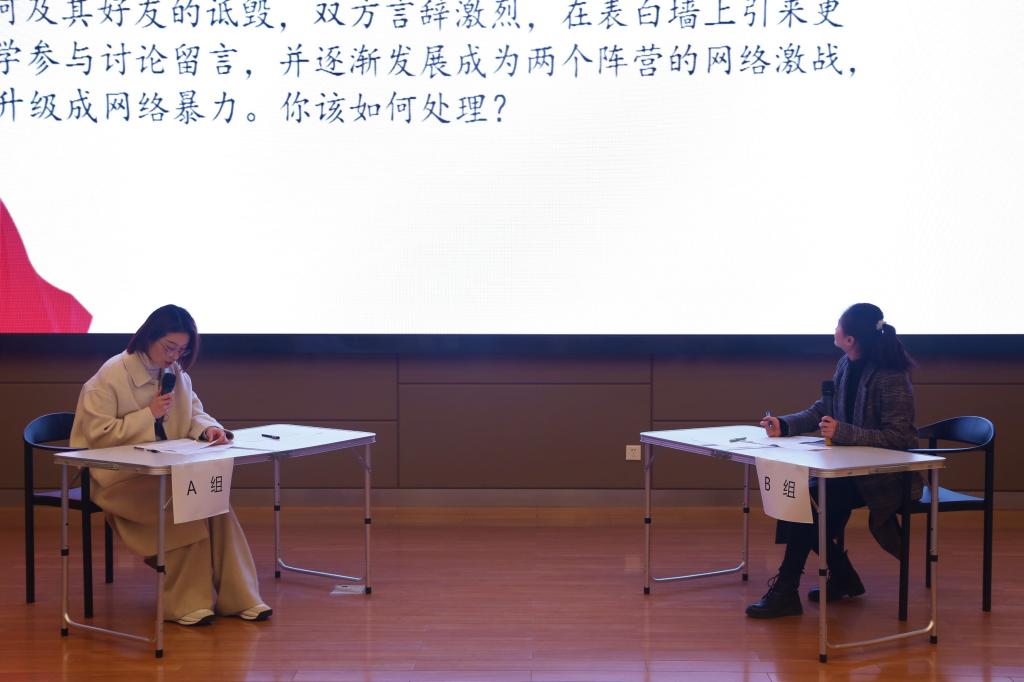 专职辅导员全员参与本次比赛,经过笔试激烈角逐,10名优秀辅导员代表在决赛现场通过案例研讨和谈心谈话两个比赛形式进行最后的比拼。案例研讨环节选取辅导员日常工作中常见的学生问题作为话题,涉及寝室矛盾、校园贷、大学生恋爱、学习习惯、网络思政等方面,辅导员两人一组对案例进行原因分析、对策研讨、规律总结等;谈心谈话环节模拟真实场景,与提问学生进行面对面交流。辅导员们在比赛中充分发挥职业素养和专业知识,坚守“三全育人”理念,展现武汉学院优良的师德师风。