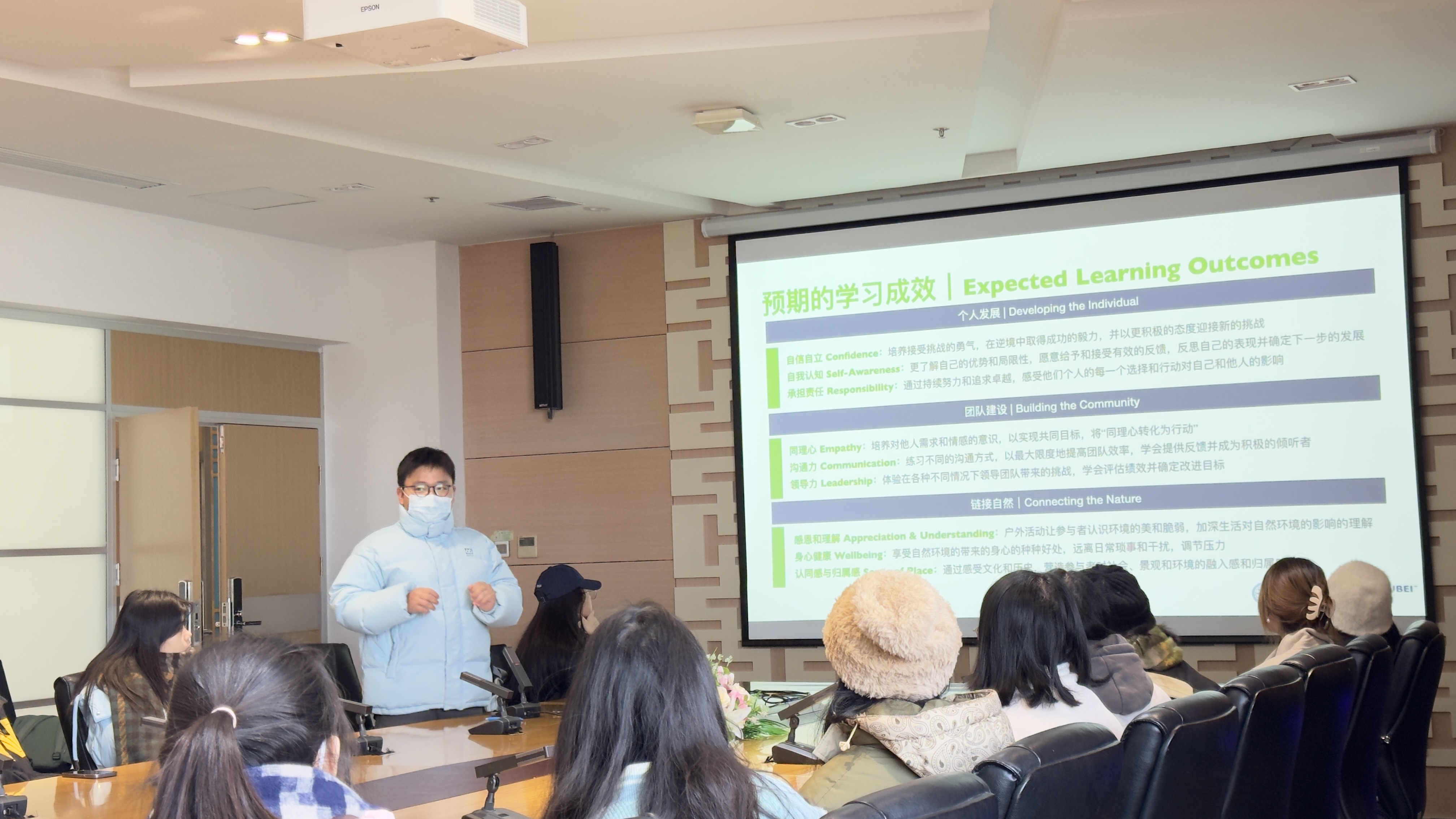 会上,曲胜介绍了湖北外展(Outward Bound Hubei)为学校提供的暑期OB神农架课程。他通过分享课程亮点与特色,让学生对Outward Bound和即将展开的OB课程有了更清晰的认识。他强调了充足的准备对于完成此次课程的重要性,并特别提醒学生们注意装备、药品和饮食的准备工作。同时,要求所有学生严格遵守安全规定,以确保每个人以及整个团队能够安全地完成培训课程。最后,他鼓励学生积极参与本次课程,这有助于在访学过程中克服可能会面对的挑战,共同为实现访学项目目标和维护访学团队利益而努力。