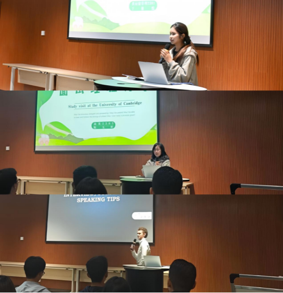 三位参与访学的同学从不同角度分享了他们的收获。英语2304班徐丽娜系统介绍了研学目的、行程安排与注意事项;工程2301班刘泽毅通过精美的照片,带领大家云游剑桥的名胜古迹;会计学2304班杨思雨则从衣食住等生活细节入手,分享了实用的海外生活经验。多元的视角让同学们对访学生活有了更立体的认知。通过真实的课堂案例、丰富的文化见闻和深刻的个人感悟,让在场同学深切感受到了世界顶尖学府的学术氛围和海外学习的独特价值,引发了同学们的浓厚兴趣和热烈反响。