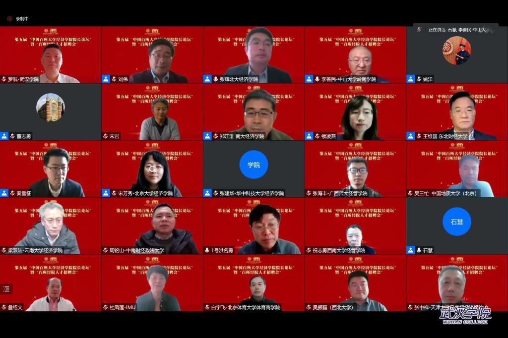12月24日,第五届“中国百所大学经济学院院长论坛”暨“百所经院人才招聘会”在北京大学经济学院成功举办。武汉学院副校长罗航教授作为特邀参会校长出席“校长论坛”,与北京大学、中山大学等22位知名高校校长线上聚首,同台论道,畅谈“中国式现代化与经济学的创新发展”。