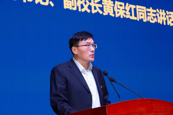 校党委副书记、副教授黄保红总结讲话。他首先向获得表彰的集体和个人表示祝贺,并向辅导员、班主任、学生干部及全体同学致以敬意和问候。他总结了过去一学年的工作成绩,指出在“十四五”收官之年,学校学生工作实现了系统性提升:一是育人体系更加健全,“一站式”学生社区模式深化,学风建设与文化节协同发力;二是招生就业量质提升,生源质量稳居同类高校前列,毕业生初次就业率超过全省平均水平;三是创新创业取得新成绩,师生在多项省级以上竞赛中获奖,创业氛围浓厚;四是实践育人品牌响亮,“三下乡”社会实践参与率超98%,志愿服务深入推进;五是辅导员队伍专业化水平不断提升,为学校高质量发展提供了重要支撑。