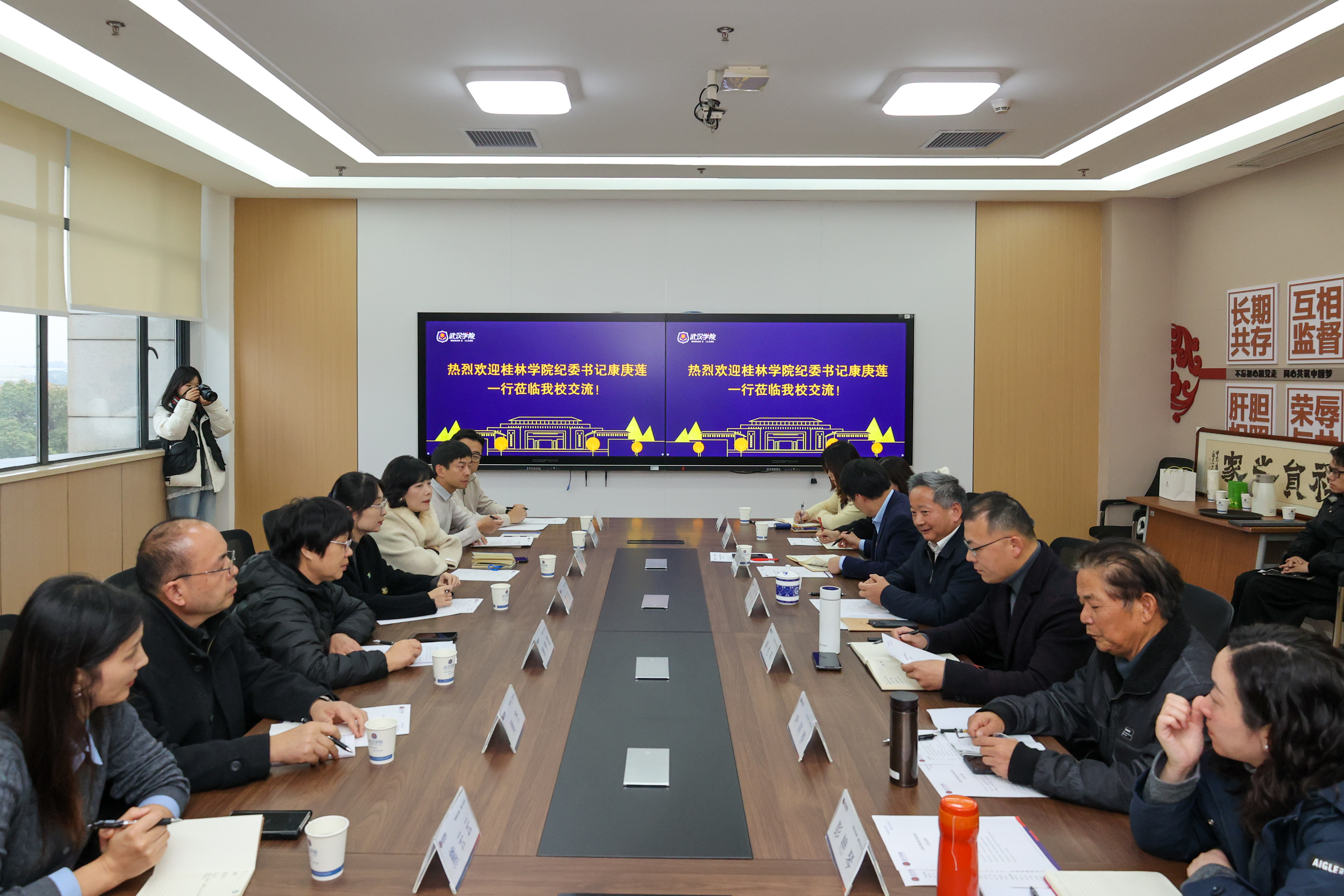 12月4日下午,桂林学院纪委书记康庚莲一行16人来校调研交流,双方围绕党建思政工作议题在行政楼201会议室展开座谈交流。校党委书记陈祖亮,纪委书记、校长助理胡达丰,党委组织部、纪委办公室、党委学生工作部、党委宣传部、艺术与传媒学院、法学院等部门相关负责人参会。