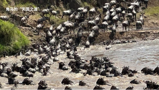 所幸仍完整地看到了角马群渡河,成百上千只“哞——呜、哞——呜”的低沉轰鸣声,夹杂着水花与蹄声,整个河流形成了一片不断起伏的震动。