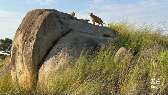 我们终于找到了电影《狮子王》“荣耀石”的原型之地。这是一座巨大的花岗岩孤丘(Kopje),在蓝天白云的映衬下,它似乎就是大地之上的天然王座。此刻,两只狮子正并肩卧在石顶,神态威严而宁静,俯视着脚下的广阔草原。