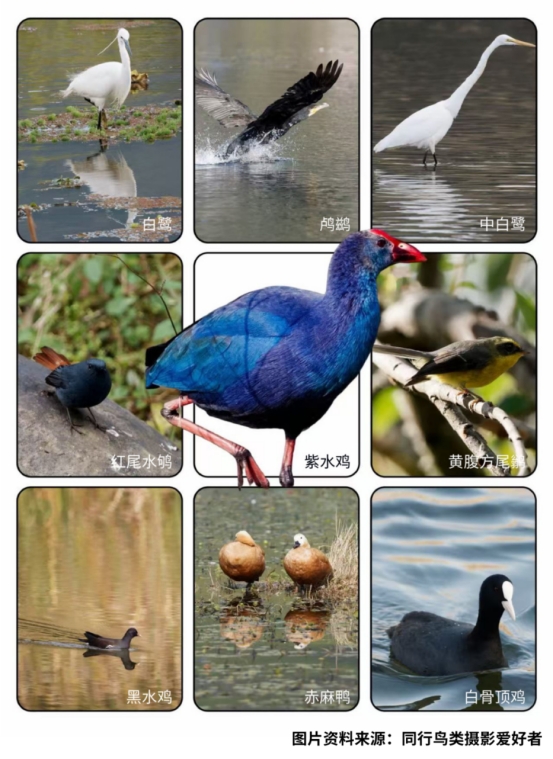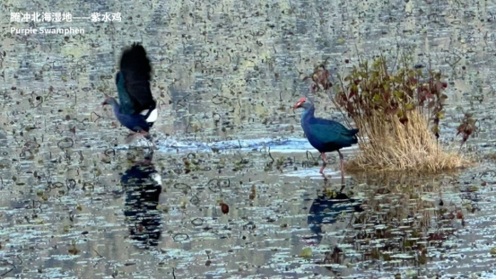 这是当天随行鸟类摄影爱好者的摄影作品,我也用手机抓拍了紫水鸡起动的瞬间。图中紫水鸡所站的水中草甸称作草排,是当地特有的湿地自然奇观,60万前火山喷发形成堰塞湖,火山灰等在水面成为水生植物基质,水草根茎经久循环交织堆积形成1至2米厚的漂浮草甸。稍微大块的草排,人畜站立其上亦可承载划动。