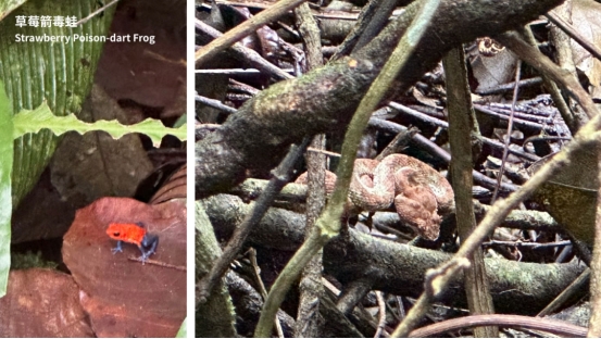 置身其中,当你被绿色完全包裹时,人会自然就放慢脚步,开始聆听,四处皆在的鸟语花香。这种喜悦不是由刺激产生的,而是来自于“发现”的瞬间。在导游的带领下,我们找到那身长不足两厘米、色彩鲜艳的草莓箭毒蛙。