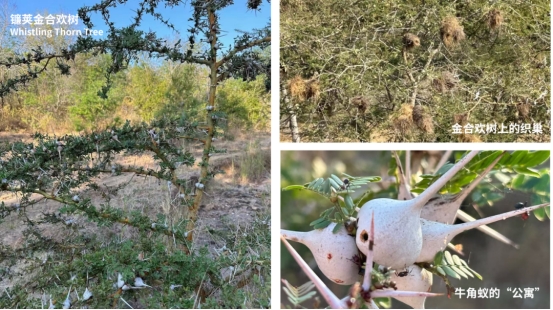 这种树浑身长满尖刺,这叫镰荚金合欢树,它有一个很是形象的英文名:“Whistling Thorn Tree”(会吹口哨的刺树)。当地人利用这些尖刺作为天然牙签,织巢鸟会在树上织巢,一般动物不敢触碰,只有长颈鹿可不是一般的食客,它脖子长、能吃到高处的嫩叶,且厚实灵活的舌头不怕刺。所以金合欢必须升级防御,这是最精彩的部分:金合欢不仅在自己中空的刺里建了“公寓”(那些洞口),还分泌花蜜,吸引牛角蚁当它的保镖部队,而当长颈鹿的口鼻靠近时,蚂蚁会立刻发动攻击,叮咬喷射长颈鹿。当然长颈鹿并不是被动躲避,它也继续进化,这是道高一尺魔高一丈的协同进化过程。
