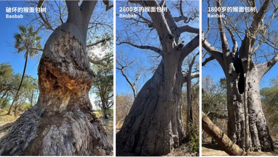 而猴面包树有着惊人的自愈能力,被大象破坏的树皮,过几年就会慢慢再生,重新包裹住树干。当地向导说,近些年,气候变化让旱季变得越来越漫长,大象们不得不更深地啃食树干,古树的自愈速度渐渐跟不上损伤的速度,如今树干上布满了深浅不一的沟壑。