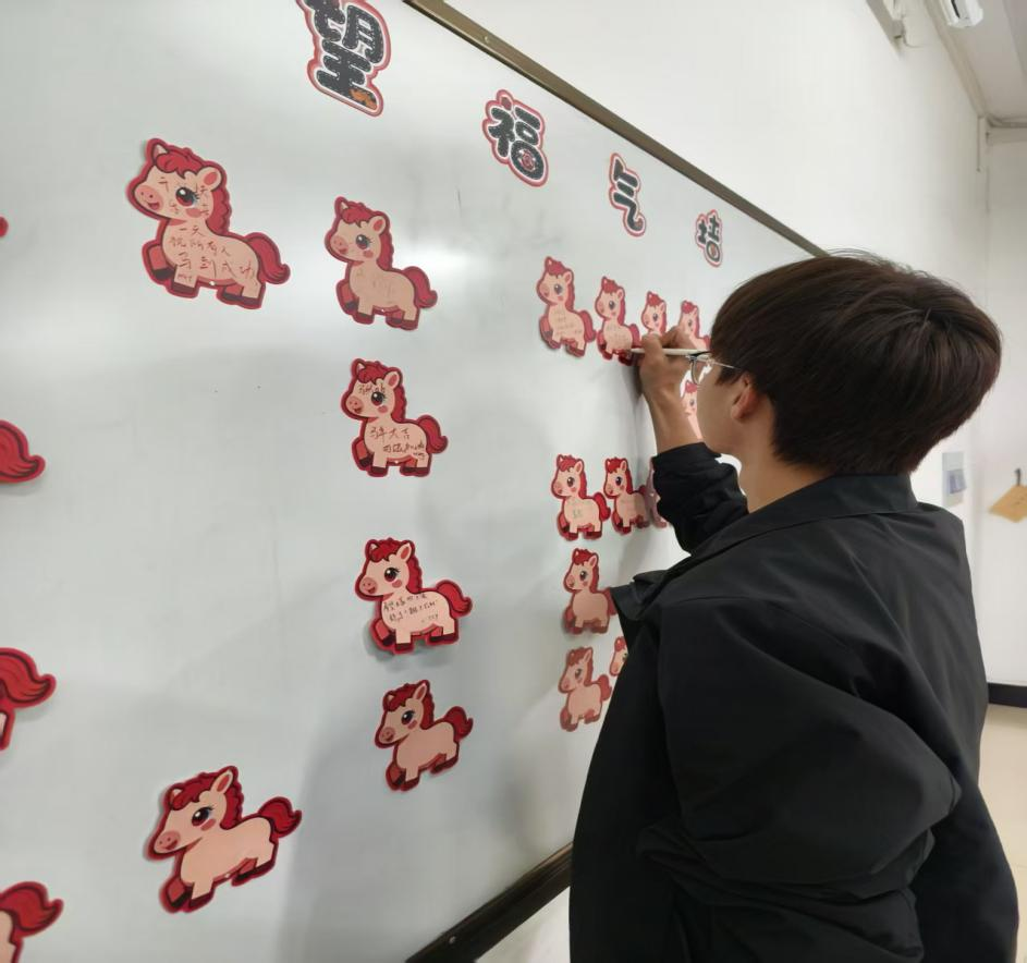 教室白板上由61张小马造型心愿卡拼组而成的“2026”新年愿望福气墙,成为全场焦点。同学们在卡片正面写下新学期目标:“希望四级顺利通关”“争取专业排名前进5名”……这些心愿错落拼搭,既象征着丙午马年的奋蹄之意,也寓意着61名同学携手启程。