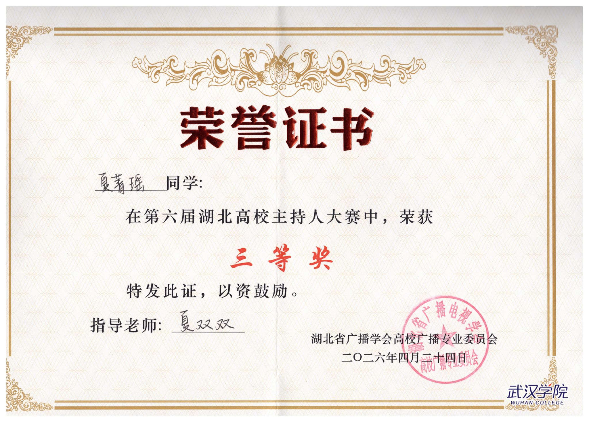 4月24日,第六届湖北高校主持人大赛在湖北经济学院举行。我校党委宣传部选送的飞扬之声广播台夏菁瑶同学,凭借过硬的专业能力与出色的临场表现,荣获大赛三等奖。这是我校首次参与该赛事。