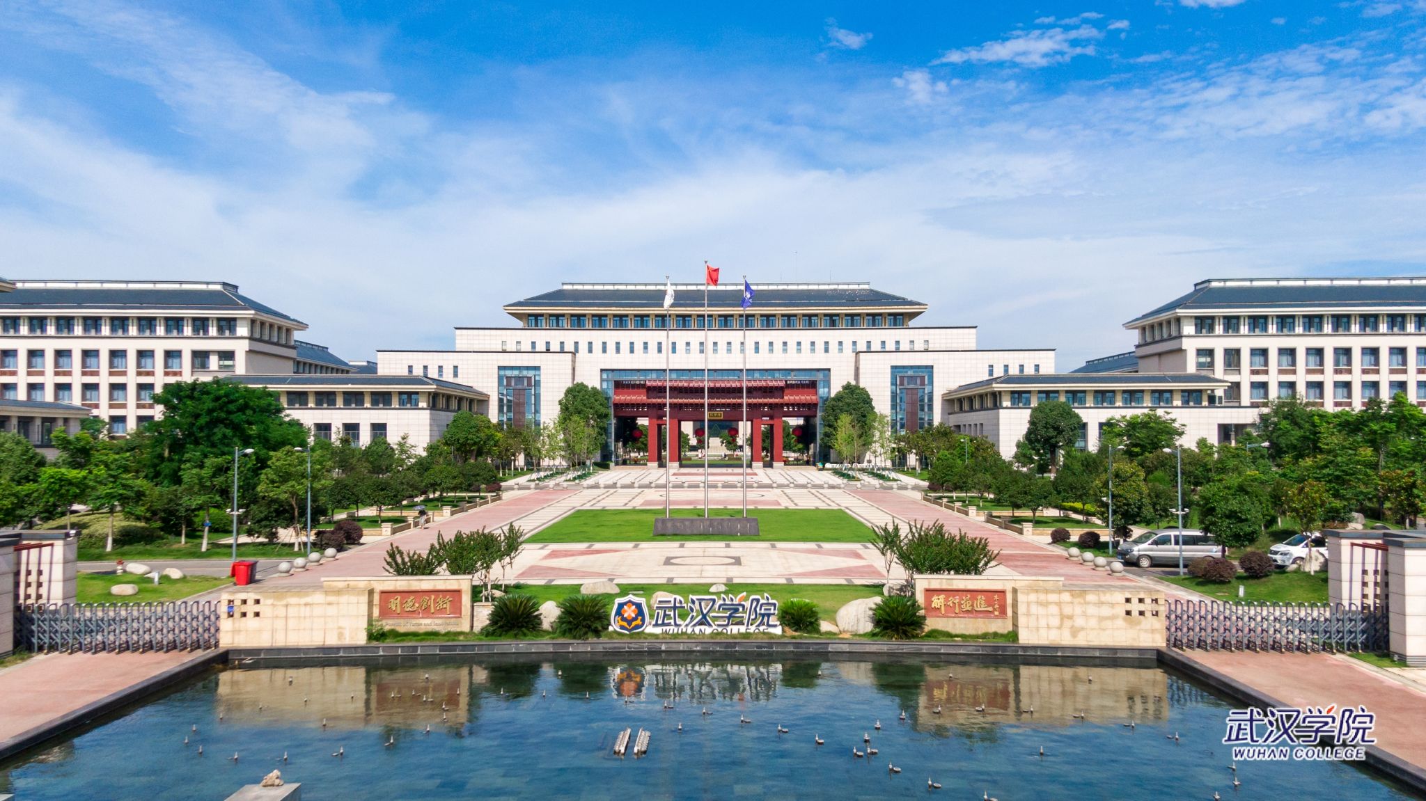 校园建设 学校位于武汉市江夏区黄家湖大道333号,两面环湖,拥有帆船教育基地,毗邻军运村,地铁8号线直达学校东门。中国建筑设计大师何镜堂院士领衔校园规划设计,建筑楼群与黄家湖得天独厚的自然环境有机融合,校园空间布局开放多样,风格独特,气势恢宏。陈一丹伉俪图书馆、马化腾教学楼、企鹅广场、知己教学楼、晨晔实验楼、弘励实验楼等捐赠冠名建筑,凸显与社会公益力量的紧密联系。