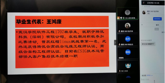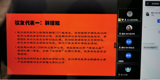 12月20日,武汉学院信息工程学院2020年校友会活动(腾讯专场)于腾讯会议上顺利召开。信息工程学院副院长兼党总支副书记吴文、辅导员甘小武以及部分校友和在校生参加会议,诚邀校友代表武汉腾讯的韩瑾璇、深圳腾讯的王鸿康分享发言和交流互动,会议由甘小武主持。