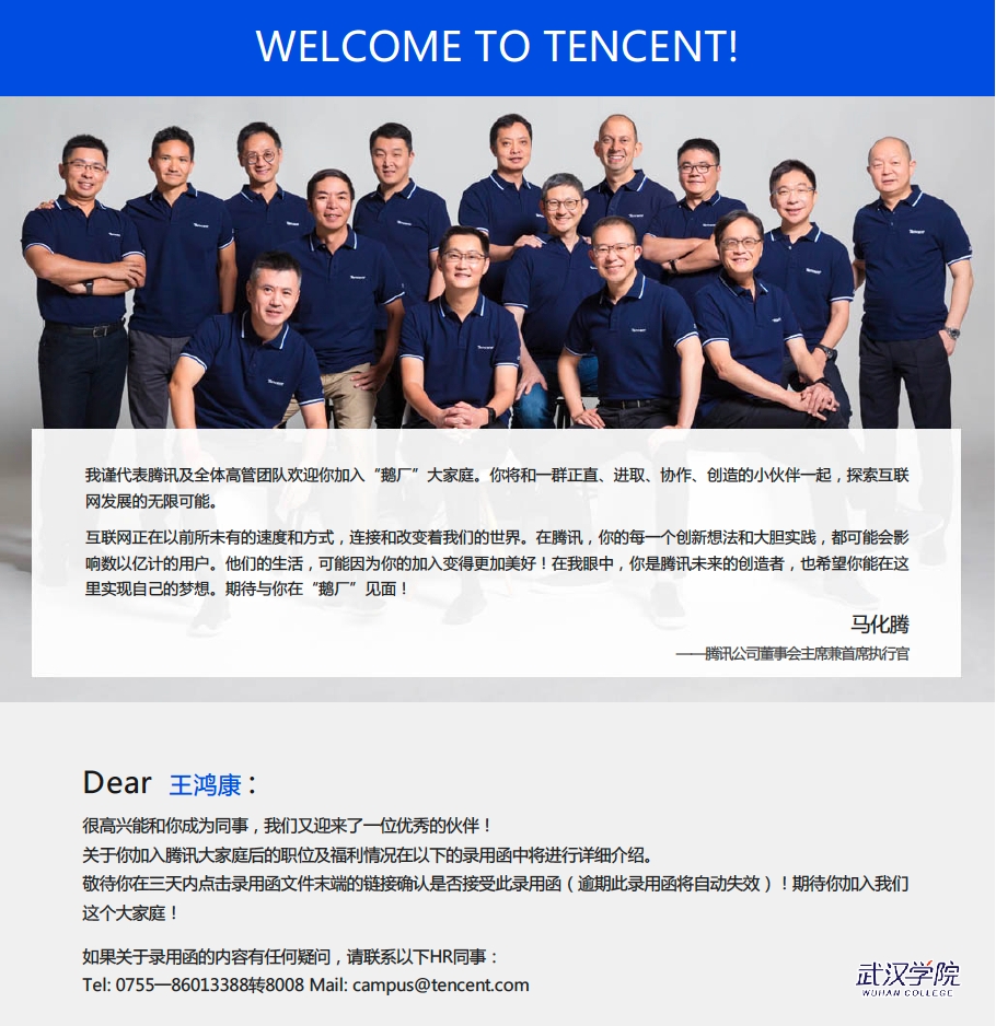 当时就很惊喜于武汉学院的办学条件和校园环境,可令他更加没想到的是2017年4月17日,学校举办了共建基金的揭牌仪式,“当时马化腾、张志东、吴宵光他们都来学校参加共建基金的仪式,”王鸿康说,“作为一个互联网爱好者,当看到“偶像”真的出现在面前时,那种感触十分震撼,顿时就对腾讯充满了向往。”