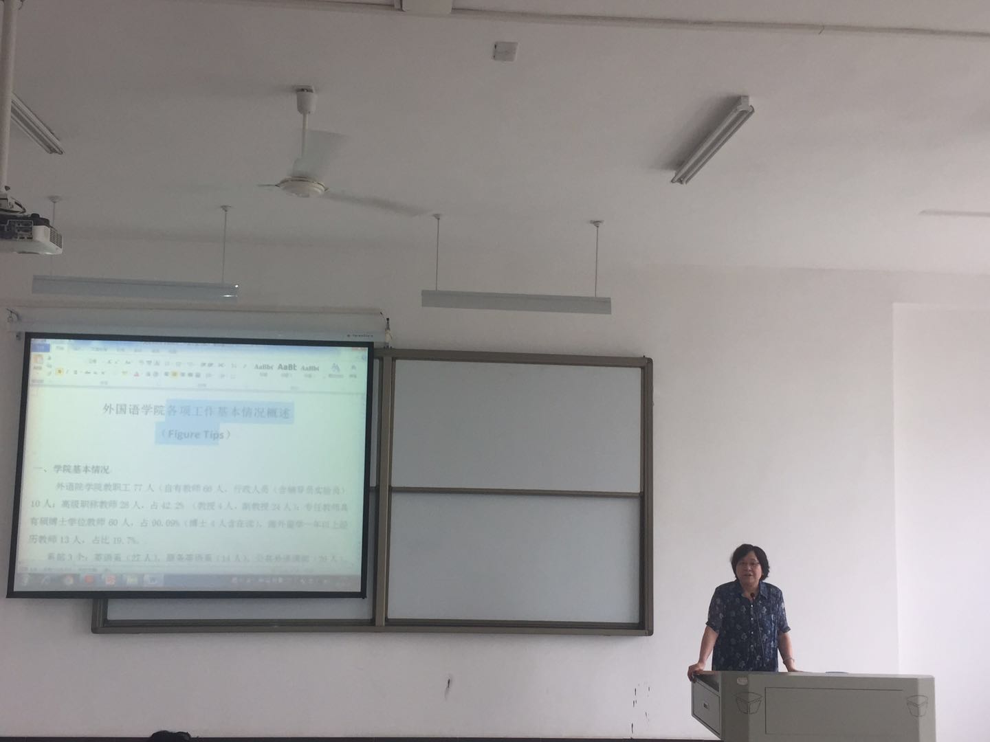 外国语学院办公室主任胡勇老师从教学管理的角度,对本学期末的教学工作、论文和实习报告存在的各种问题、试卷归档工作、下学期教学任务安排、课程大纲的编写、专升本考试等工作,予以具体的布置与安排。